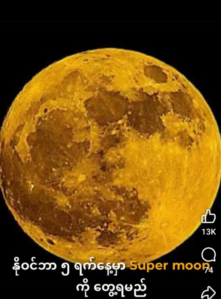 နိုဝင်ဘာ ၅ ရက်ည ဟာ မြန်မာနိုင်ငံအပါအဝင် တစ်ကမ္ဘာလုံးက မြင်တွေ့နိုင်မယ့် ၂၀၂၅ ခုနှစ်ရဲ့ အကြီးဆုံးနှင့် အတောက်ပဆုံး Super Moon ဖြစ်စဉ် ဖြစ်ပေါ်မယ့် လပြည့်ညလည်း ဖြစ်ပါတယ်။
