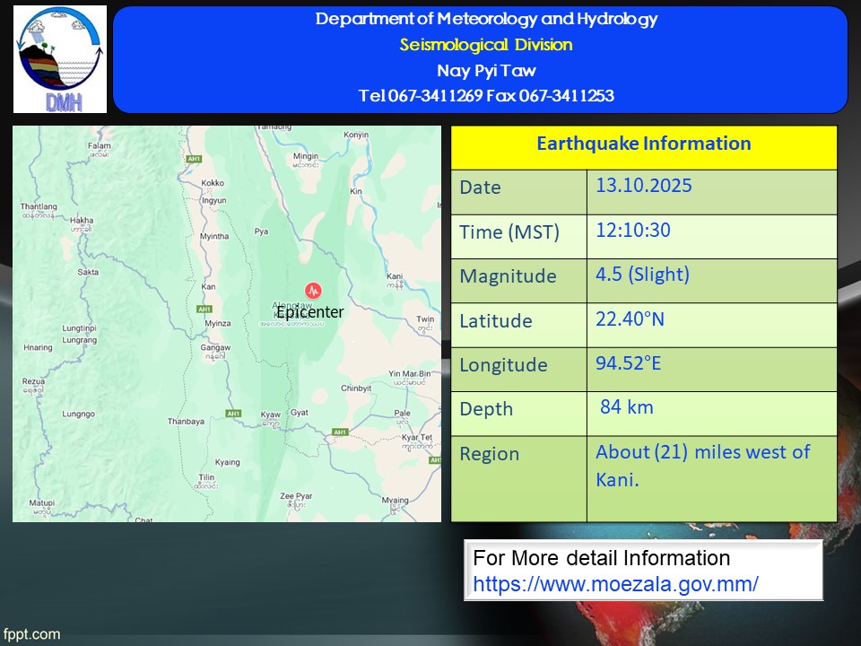 ၂၀၂၅ ခုနှစ်၊ အောက်တိုဘာလ ၁၃ ရက်နေ့ မွန်းလွဲပိုင်းမှာ စစ်ကိုင်းတိုင်းဒေသကြီး၊ကနီမြို့ ရဲ့ အနောက်ဘက် မိုင် ၂၁မိုင် အကွာမှာ အင်အား ရစ်(ခ်)တာစကေး ၄.၅ အဆင့်ရှိတဲ့ မြေငလျင်တစ်ခု လှုပ်ခတ်သွားကြောင်း မိုးလေဝသနှင့် ဇလဗေဒညွှန်ကြားမှုဦးစီးဌာနက ထုတ်ပြန်ထားပါတယ်။