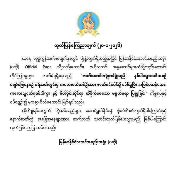 အဲဒီ့ကိစ္စရပ်အတွက် လိုအပ်သည်များ ဆောင်ရွက်နိုင်ရန် စုံစမ်းစိစစ်လျက်ရှိကြောင်းနဲ့ နောက်ဆက်တွဲ အခြေအနေများအား ဆက်လက်သတင်းထုတ်ပြန်သွားမည်ဖြစ်ကြောင်း မြန်မာနိုင်ငံ သဘင်အစည်းအရုံးက ကြေညာပါတယ်။