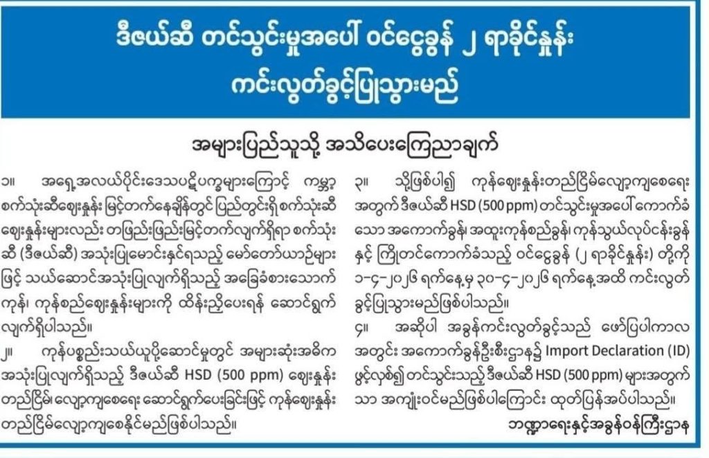 အကောက်ခွန်ဦးစီးဌာနက Import Declaration (ID)ဖွင့်လှစ်တင်သွင်းတဲ့ ဒီဇယ်ဆီ HSD (500 ppm)များအ တွက်သာအကျုံးဝင်မယ်လို့လည်း ထုတ်ပြန်ချက်မှာပါဝင်ပါတယ်။