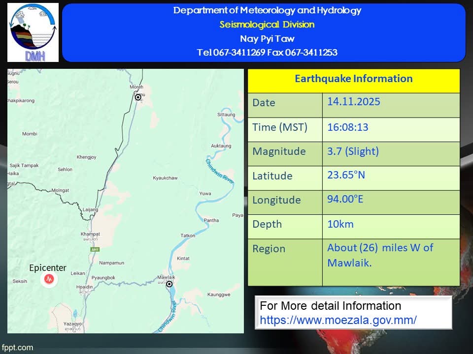 ၂၀၂၅ ခုနှစ်၊ နိုဝင်ဘာလ ၁၄ ရက်နေ့၊ မြန်မာစံတော်ချိန် (၁၆)နာရီ၊ (၀၈)မိနစ်၊ (၁၃) စက္ကန့် အချိန်တွင် တမူးမြေငလျင်စခန်းမှ အနောက်တောင်ဘက် (၄၄) မိုင်ခန့်ကွာဝေးသော မြန်မာနိုင်ငံပြည်တွင်း (မော်လိုက်မြို့၏ အနောက်ဘက် (၂၆) မိုင်ခန့်အကွာ)မှာ လှုပ်ခတ်ခဲ့တာ ဖြစ်ပါတယ်။