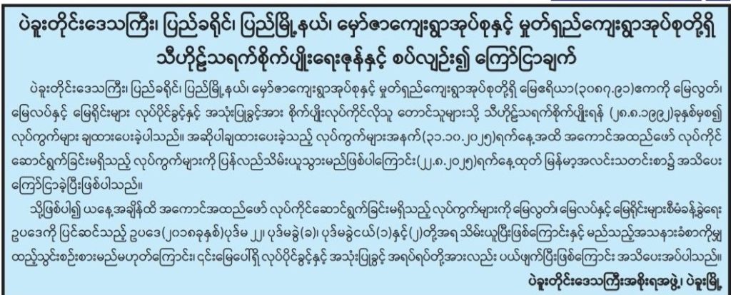 ပြည်မြို့မှာ သီဟိုဠ်သရက်စိုက်ပျိုးရေးလုပ်ငန်းလုပ်ကိုင်ခြင်းမရှိတဲ့ သီဟိုဠ်သရက်စိုက်ပျိုးရေးဇုန်ရှိ လုပ်ကွက်တွေကို ပြန်လည်သိမ်းယူလိုက်ပြီလို့ သိရပါတယ်။