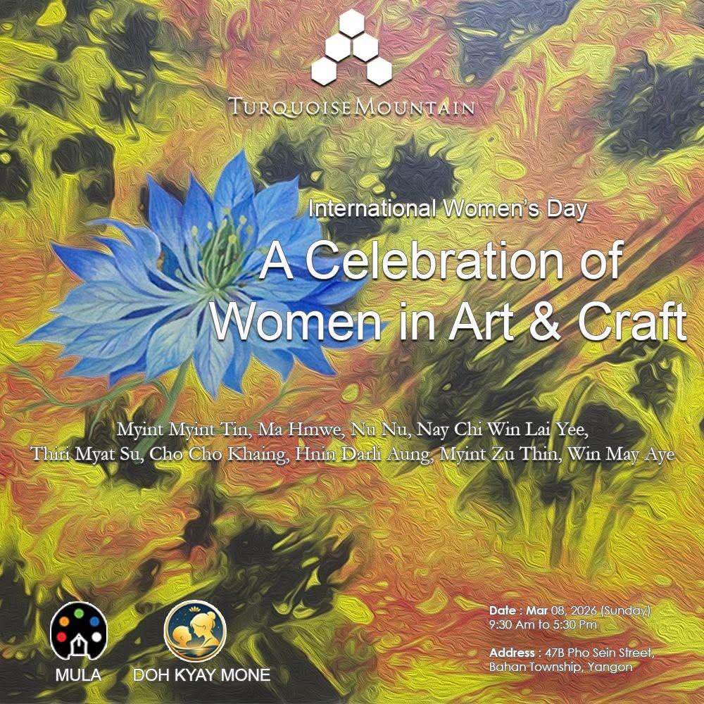 လာမယ့်မတ်လ ၈ ရက်မှာ’အပြည်ပြည်ဆိုင်ရာအမျိုးသမီးများနေ့’ အထိမ်းအမှတ်အဖြစ် အမျိုးသမီး လက်မှုပညာရှင်၊ အနုပညာရှင်နဲ့ ဖန်တီးသူများရဲ့ လက်ရာတွေကို တစ်နေရာတည်းမှာ ခံစားနိုင်ဖို့ Turquoise Mountain Myanmar က ဦးစီးကျင်းပပြီး MULA မှ ပူးပေါင်းပါဝင်တဲ့ Art Exhibition လေးကျင်းပသွားမှာဖြစ်ပါတယ်။