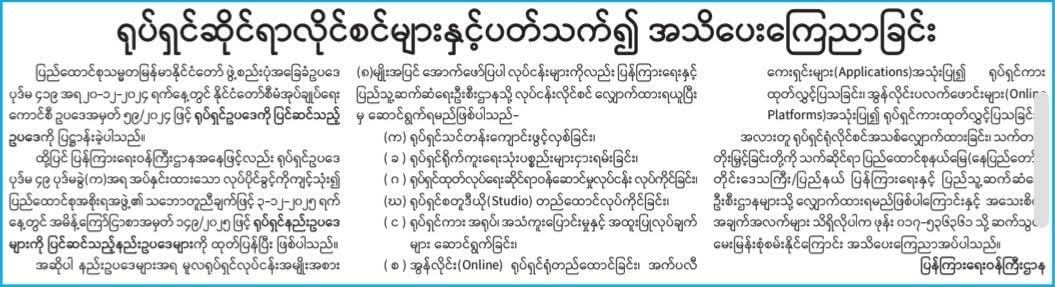 ရုပ်ရှင်ဆိုင်ရာလုပ်ငန်း(၆)ခုထပ်တိုးလိုင်စင်လျှောက်ရမည်ဟုထုတ်ပြန်