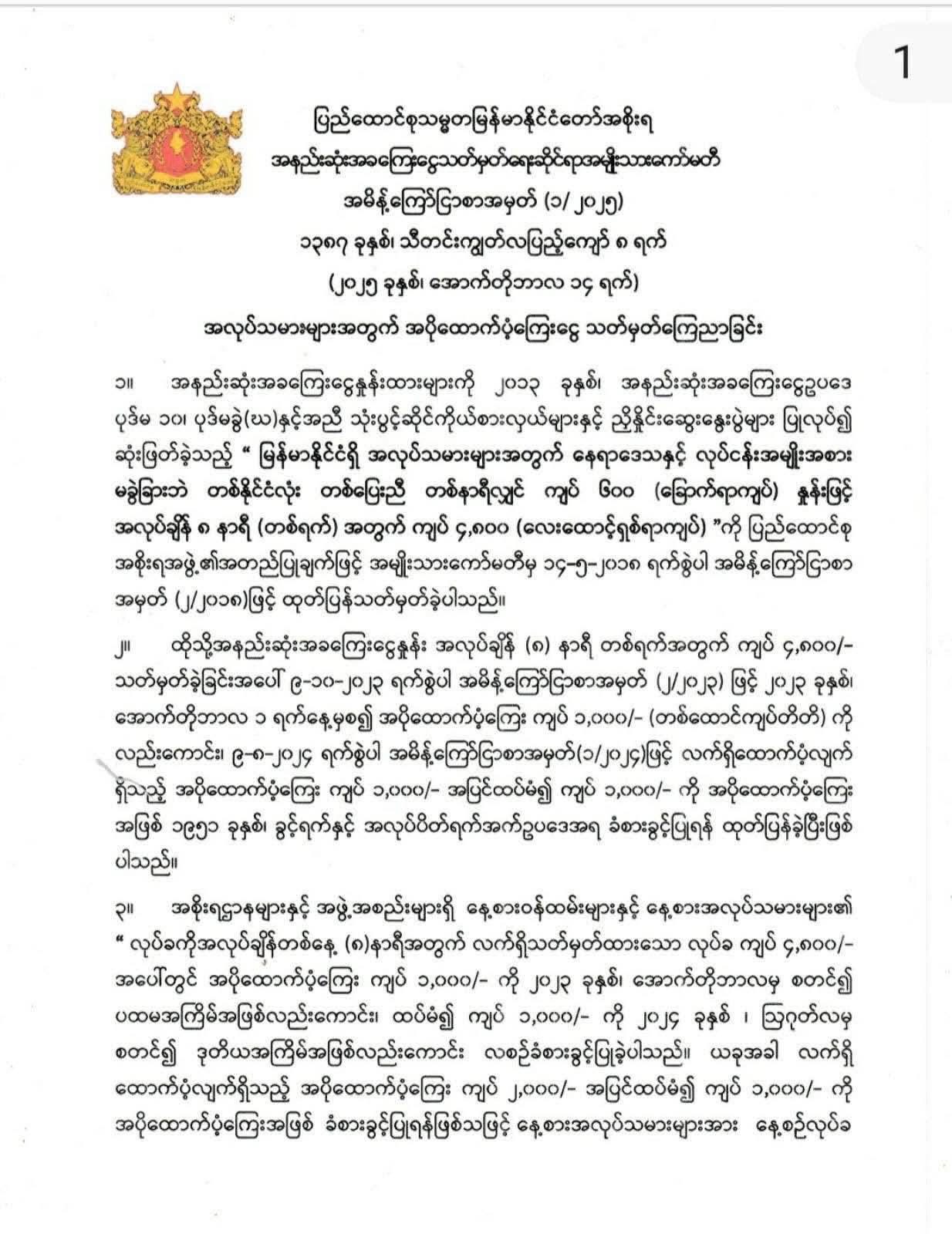 ပုဂ္ဂလိကလုပ်သားများအတွက်အနည်းဆုံးလုပ်ခကျပ် ၁၀၀၀ တိုးပေး၊ စုစုပေါင်းနေ့စားလုပ်ခကျပ် ၇၈၀၀ သတ်မှတ်
