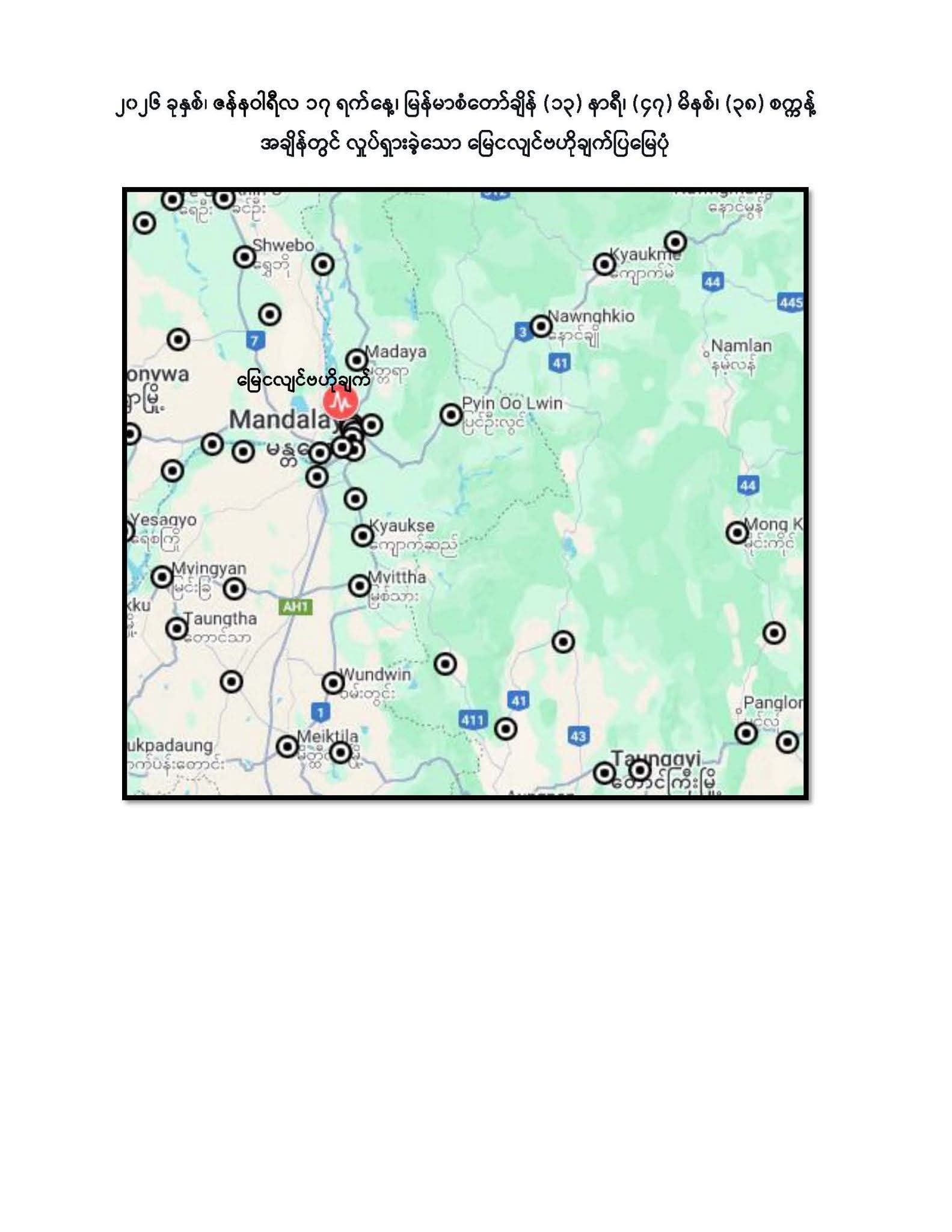 မန္တလေး၊အောင်မြေသာစံ၌ဗဟိုပြုပြီး ငလျင်လှုပ်